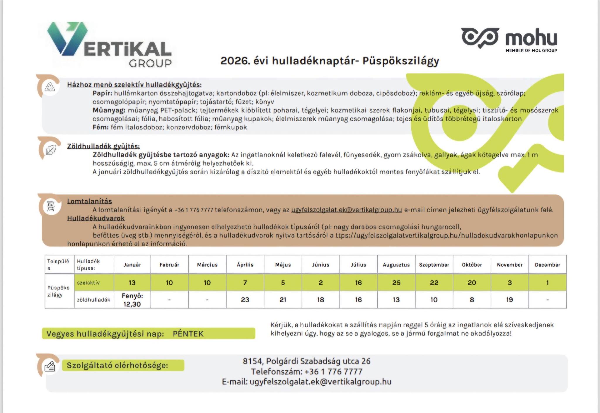 Tájékoztatjuk Önöket, hogy 2026. januárjától a kommunális hulladék gyűjtési napja csütörtöki napról pénteki napra módosult, mely változás a mellékelt gyűjtési naptárban már átvezetésre került.
