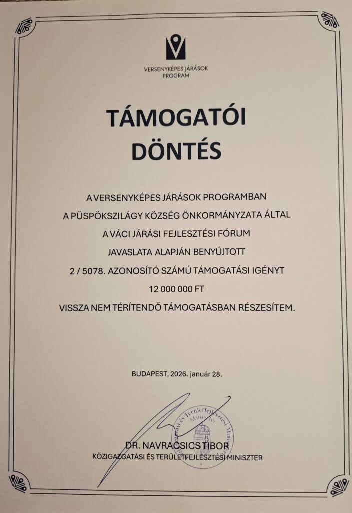 Örömmel tájékoztatom Önöket, hogy a Versenyképes Járások Program keretében átvettem a támogatói okiratot Dr. Rétvári Bence országgyűlési képviselőtől. A támogatást településünk kamerarendszer beszerzésére, illetve a rendszer kiépítésére kívánja fordítani.