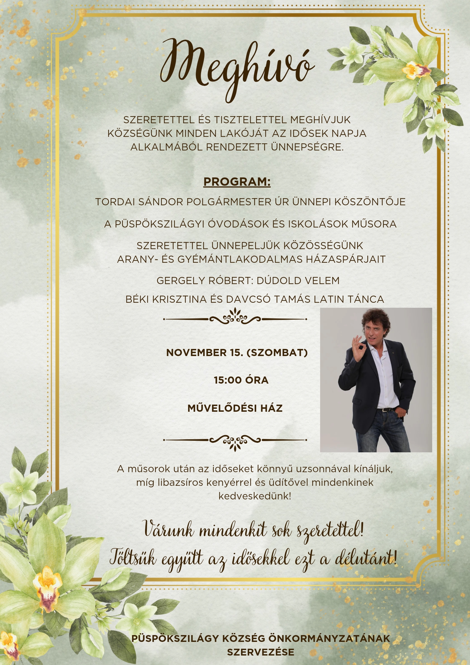 Szeretettel és tisztelettel meghívjuk községünk minden lakóját az Idősek napja alkalmából rendezett ünnepségre. Program: Tordai Sándor polgármester úr ünnepi köszöntőjeA püspökszilágyi óvodások és iskolások műsora