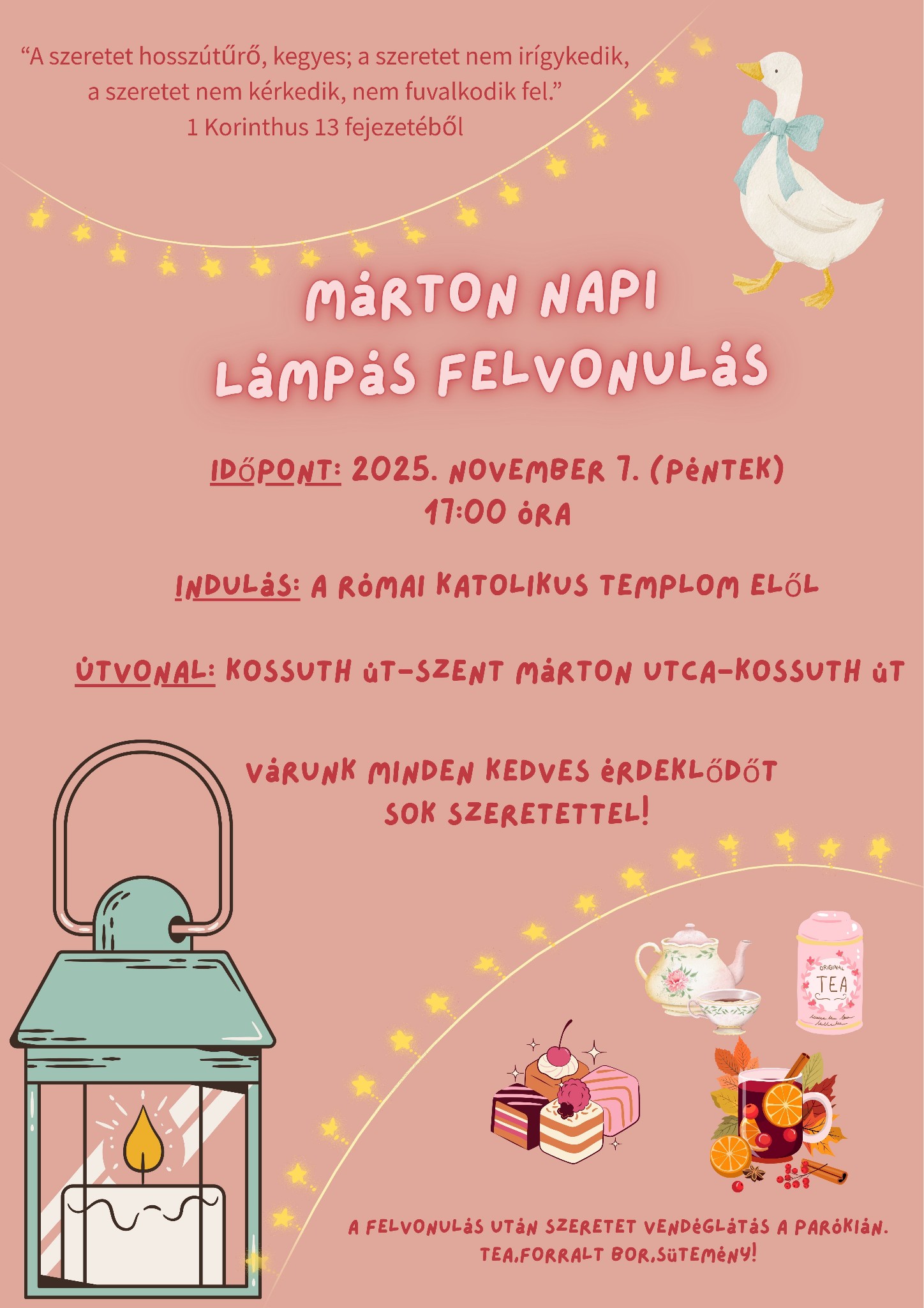 Szeretettel hívunk és várunk minden gyermeket, szülőt és érdeklődőt november 7-én, pénteken a hagyományos Márton-napi lámpás felvonulásra! Indulás: 17 órakor a Templom elől A felvonulás